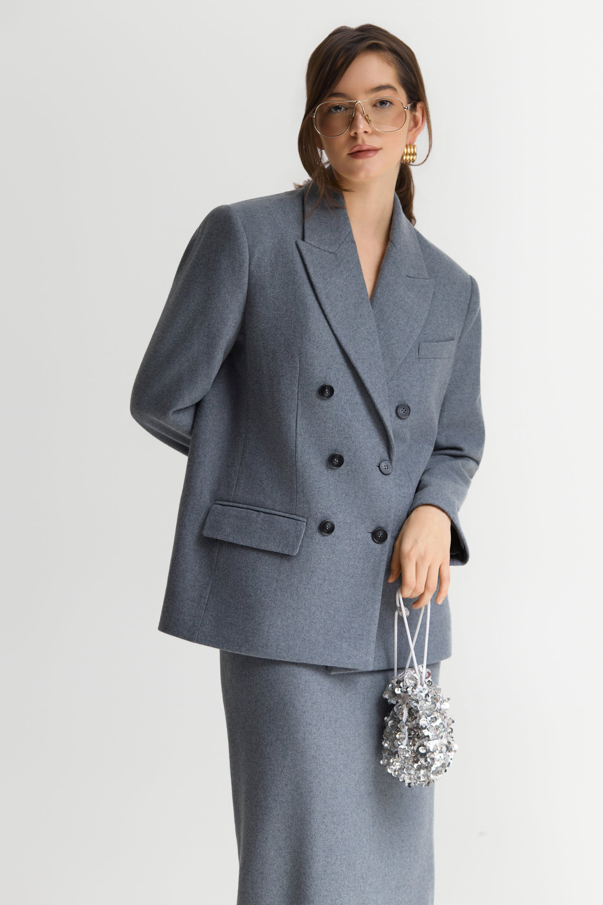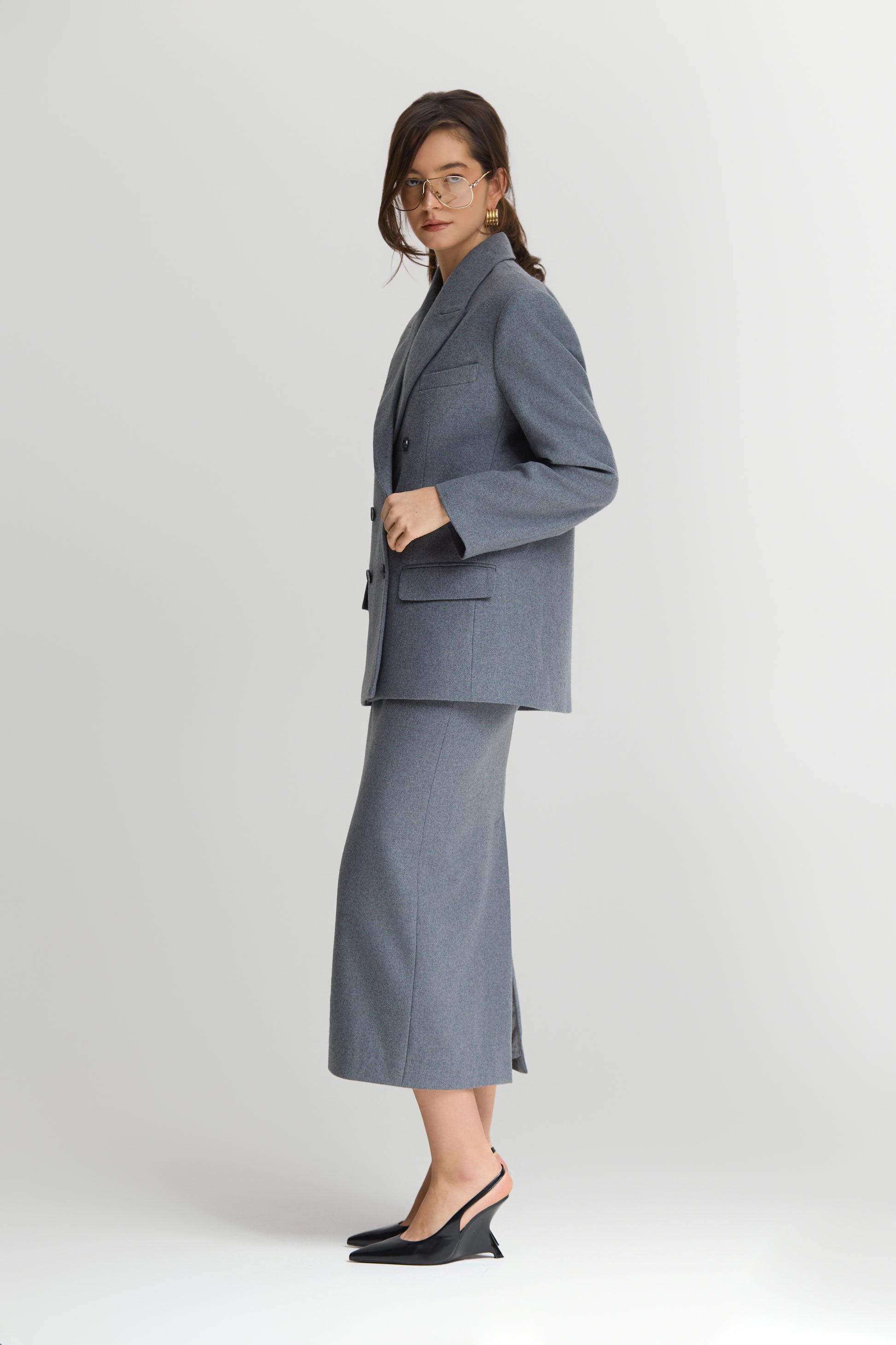 Спідниця міді довжини, прямого крою, з чіткою вертикальною лінією, яка візуально витягує силует. Посадка висока, талія акуратно підкреслена, без зайвого декору — усе тримається на чистоті форми.