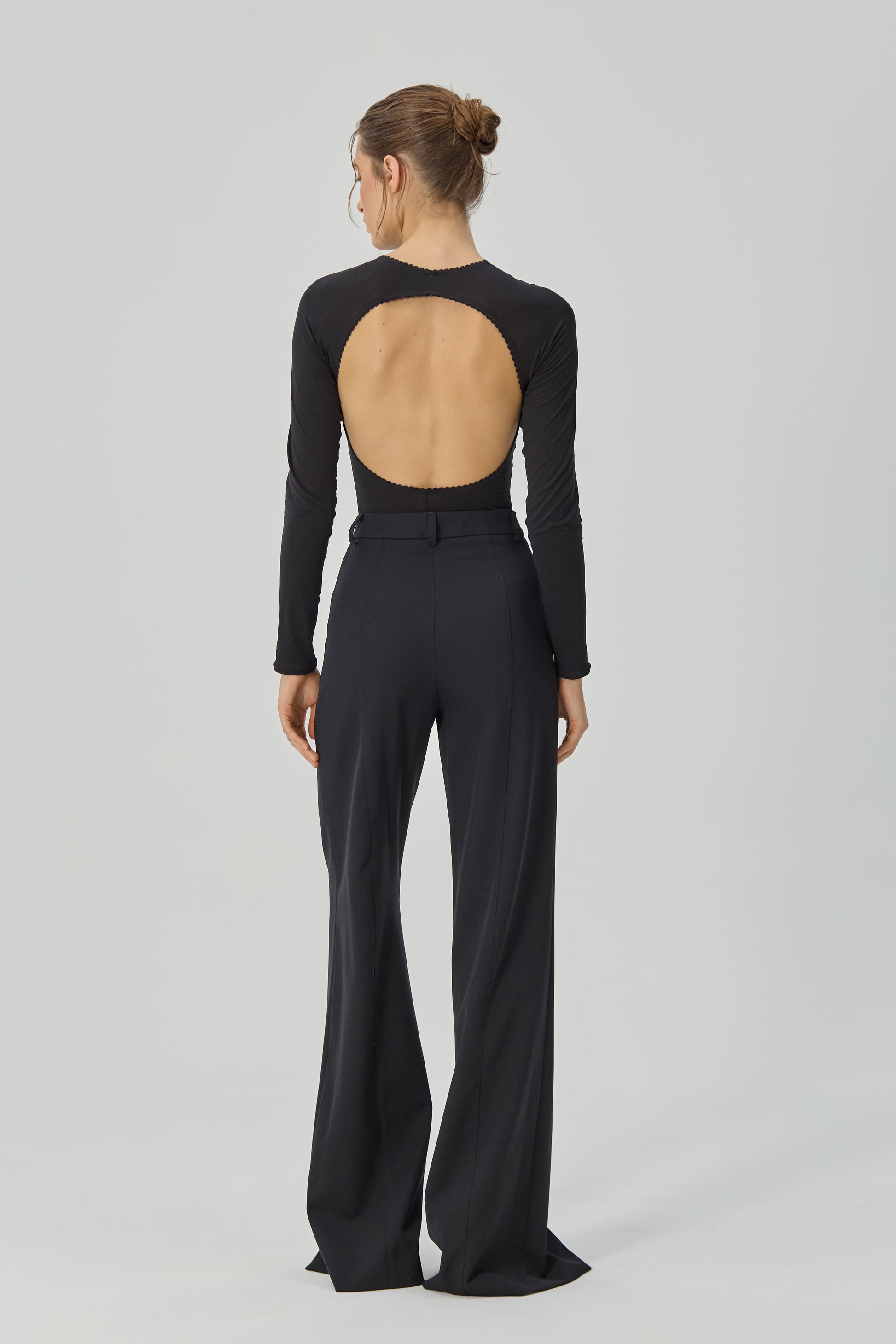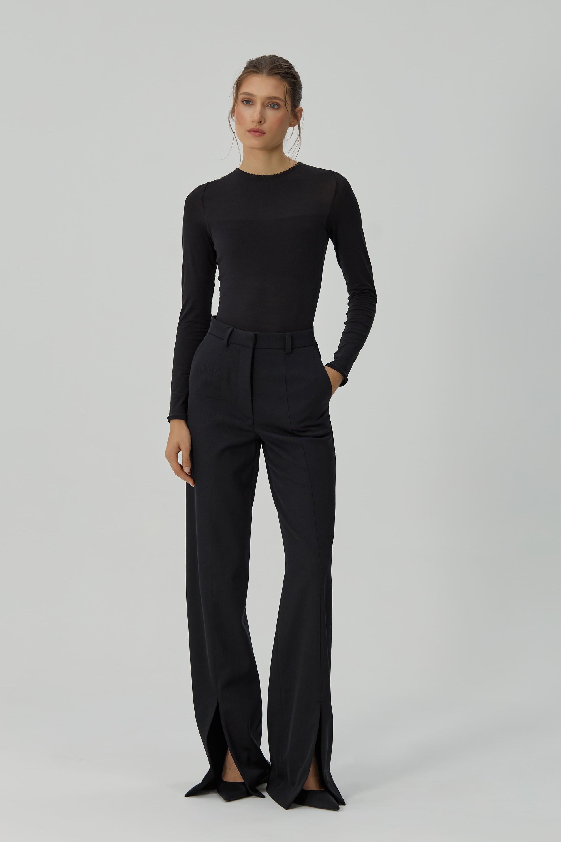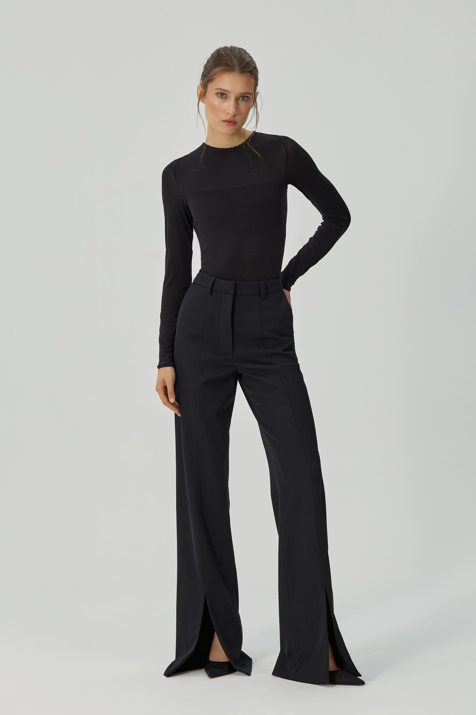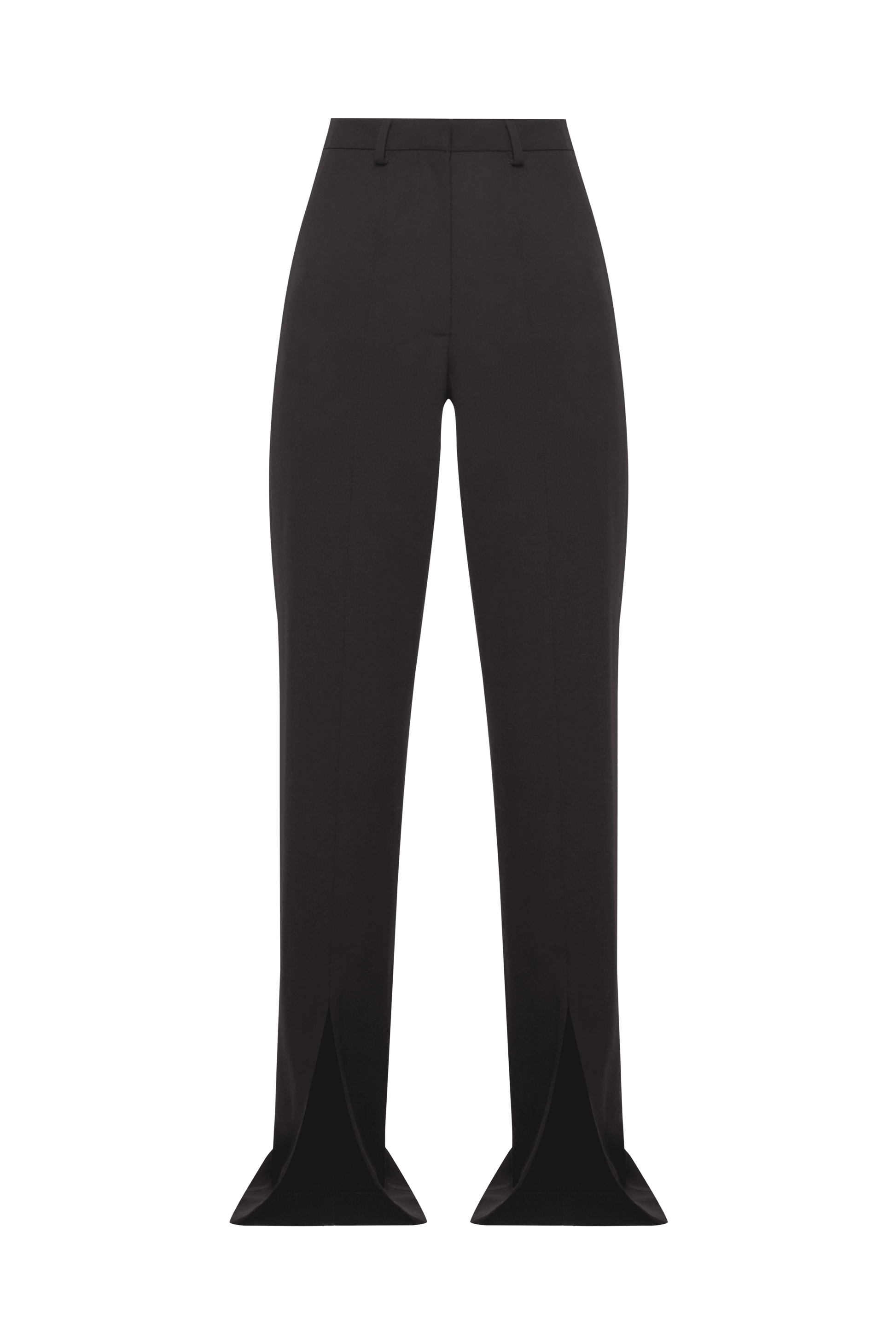 These black slit trousers from Sarna are a balance between classic and bold, created for those who like to make a statement in style. The slits in the front add a bold look, while the straight silhouette and high rise visually lengthen the legs, creating an elegant figure.