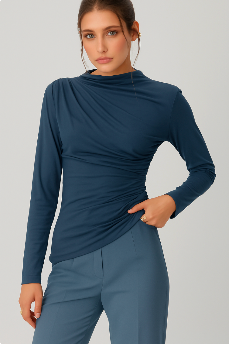 М’яка драпіровка й асиметричний низ створюють динаміку, а насичений синій колір додає образу впевненості.