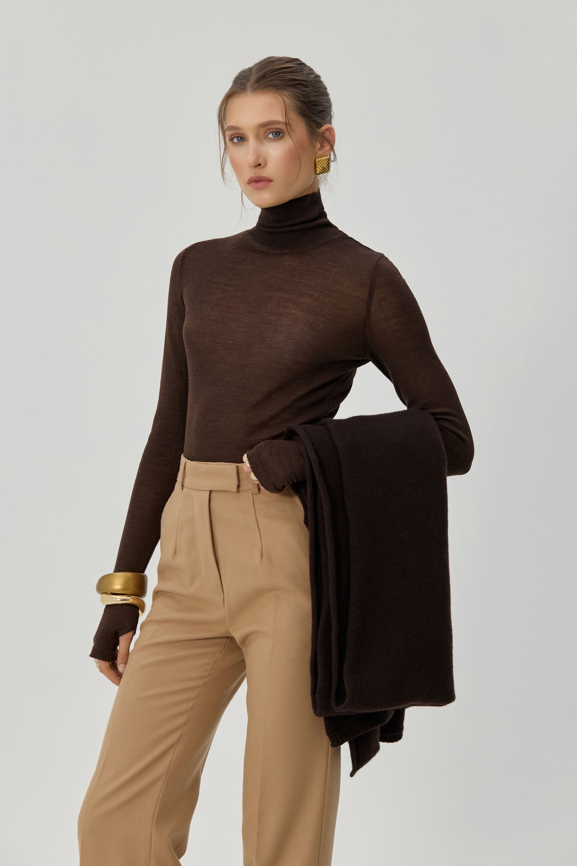 Тонка, трохи прозора тканина грає зі світлом, а отвори для пальців додають сучасності.