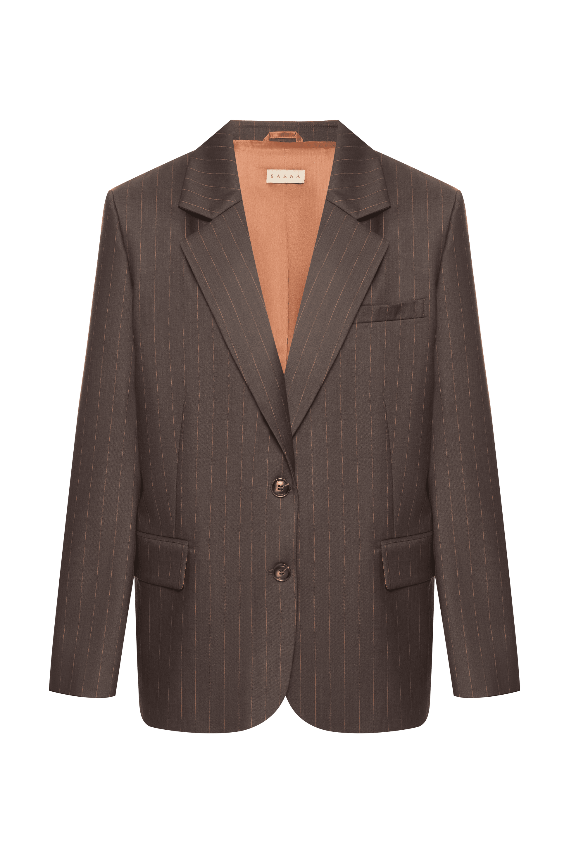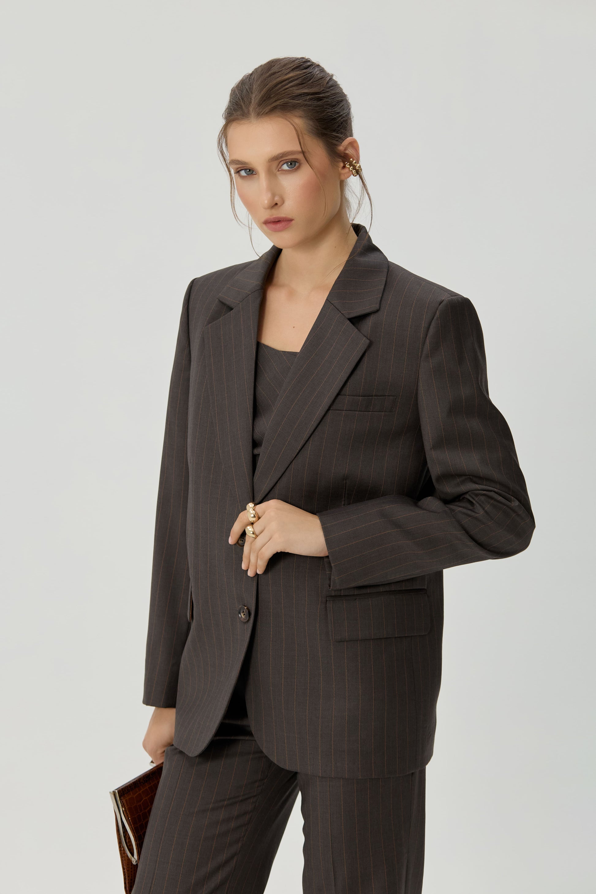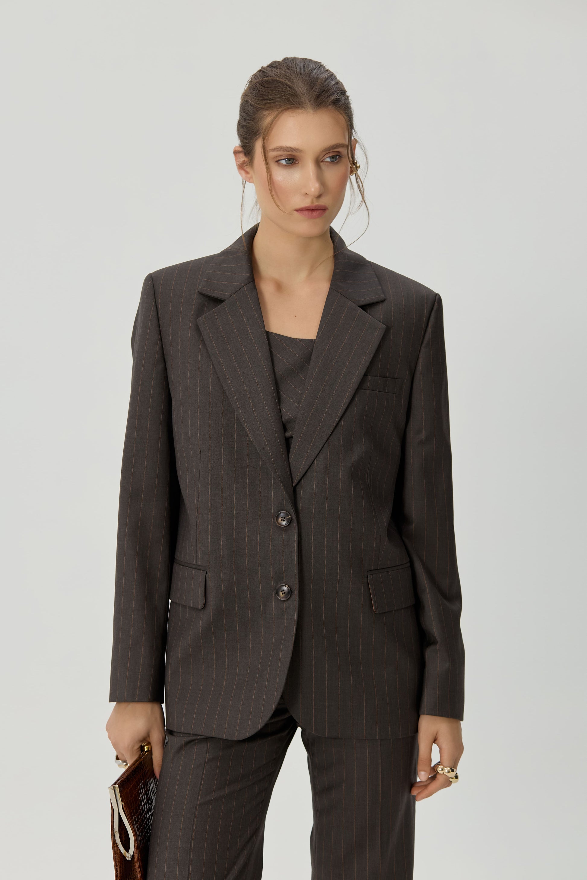 Теракотова смужка додає глибини, а вовна робить жакет не лише стильним, а й практичним для прохолодного сезону.