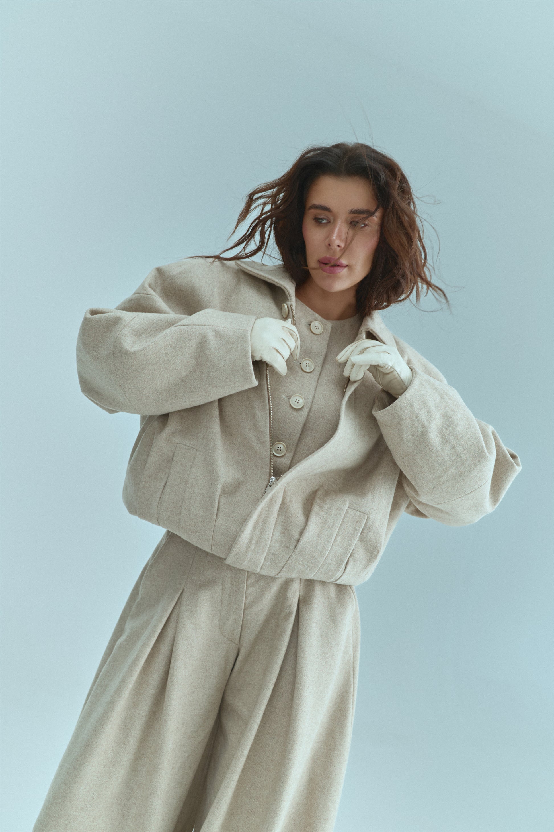Унікальна в своєму роді куртка-трансформер, яка легким рухом перетворюється на стильний жилет. Це той момент, коли два образи в одному і обидва шикарні. Мінімалістичний крій і базовий відтінок роблять цю модель універсальною — вона легко поєднується з широкими брюками з цієї ж колекції або класичними брюками, джинсами чи спідницею.