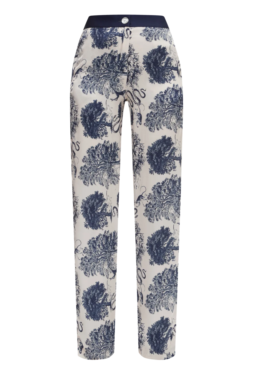 Молочні шовкові штани з синім принтом акцентують увагу на легкості і свіжості. Прямий крій і натуральний шовк забезпечують комфорт. Цей дизайн народився з ідеї поєднати розкіш і зручність.