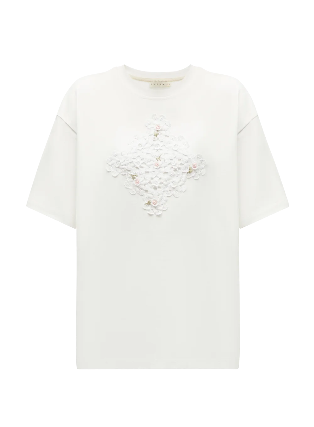 Бавовняна футболка з ніжною мереживною нашивкою на грудях. Маленькі рожеві квіти додають їй ледь помітного, але дуже жіночного акценту. Легка, повітряна, з ідеальною посадкою.